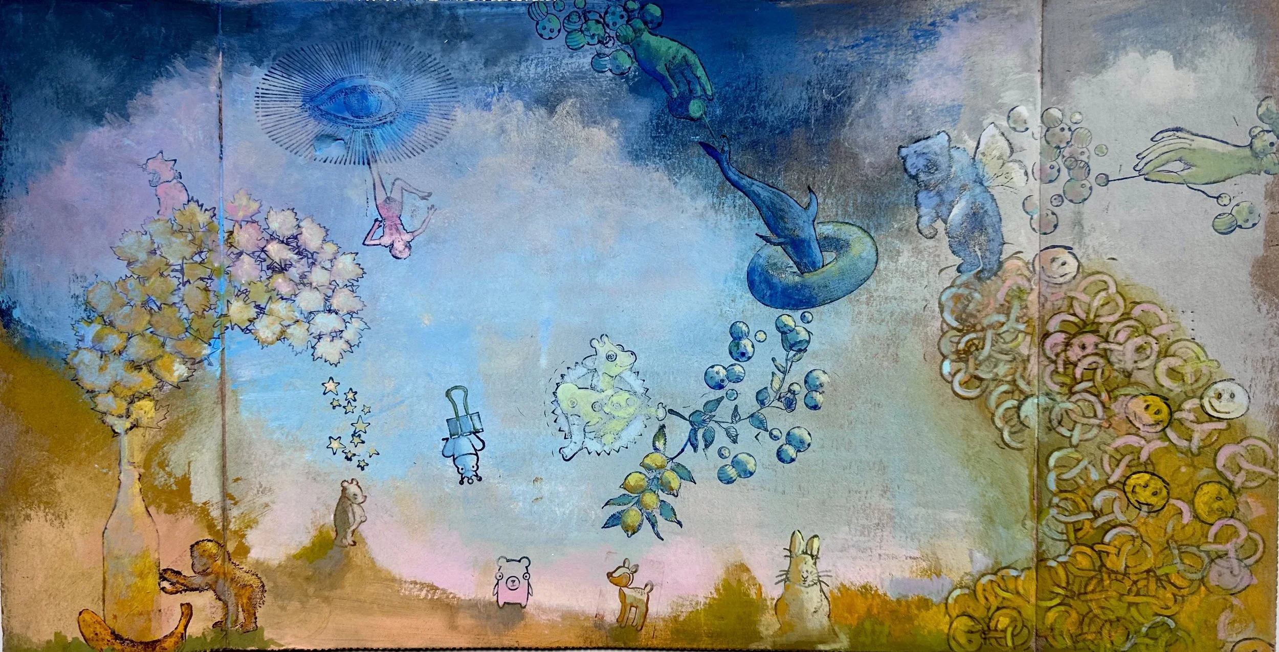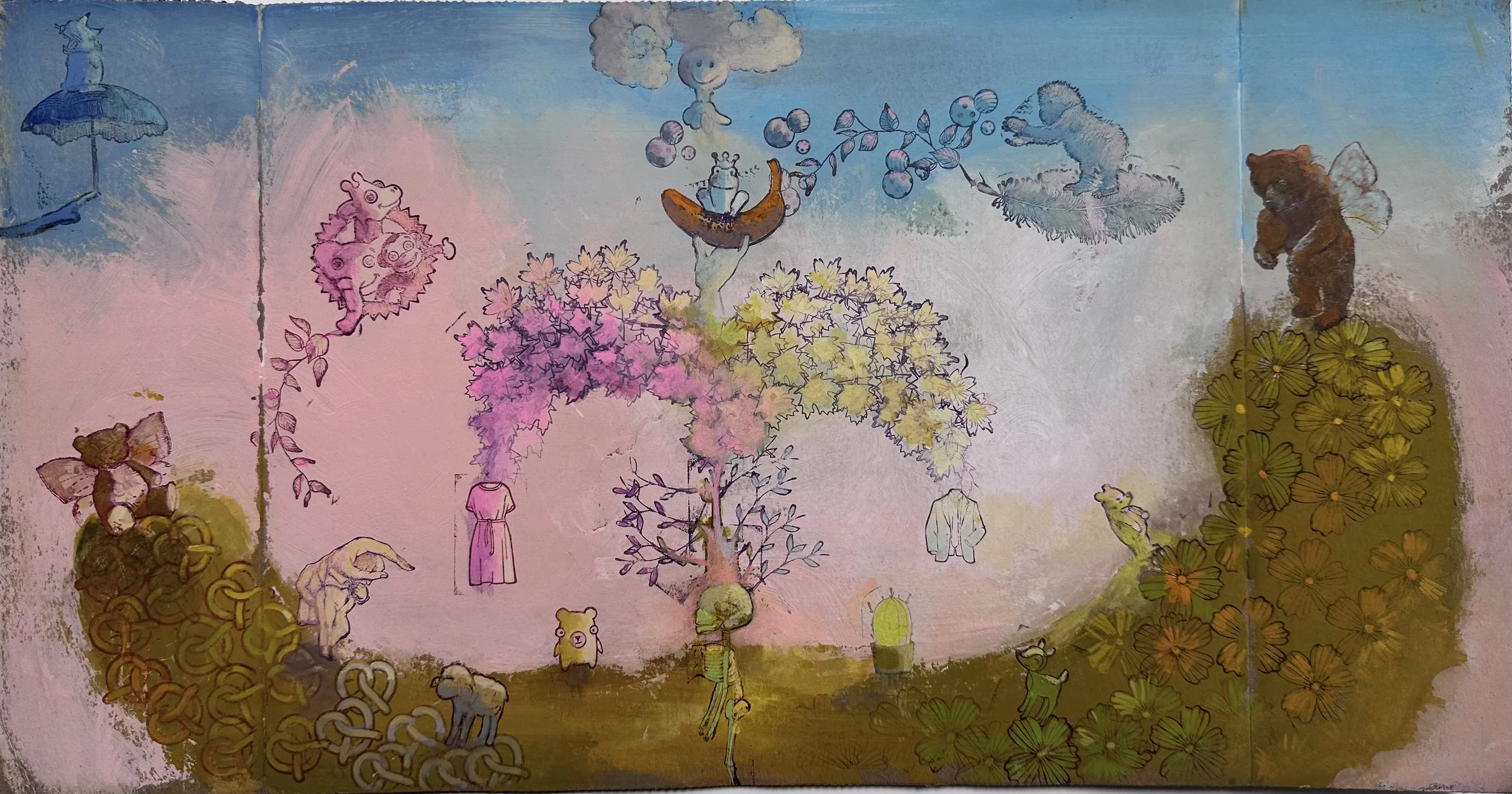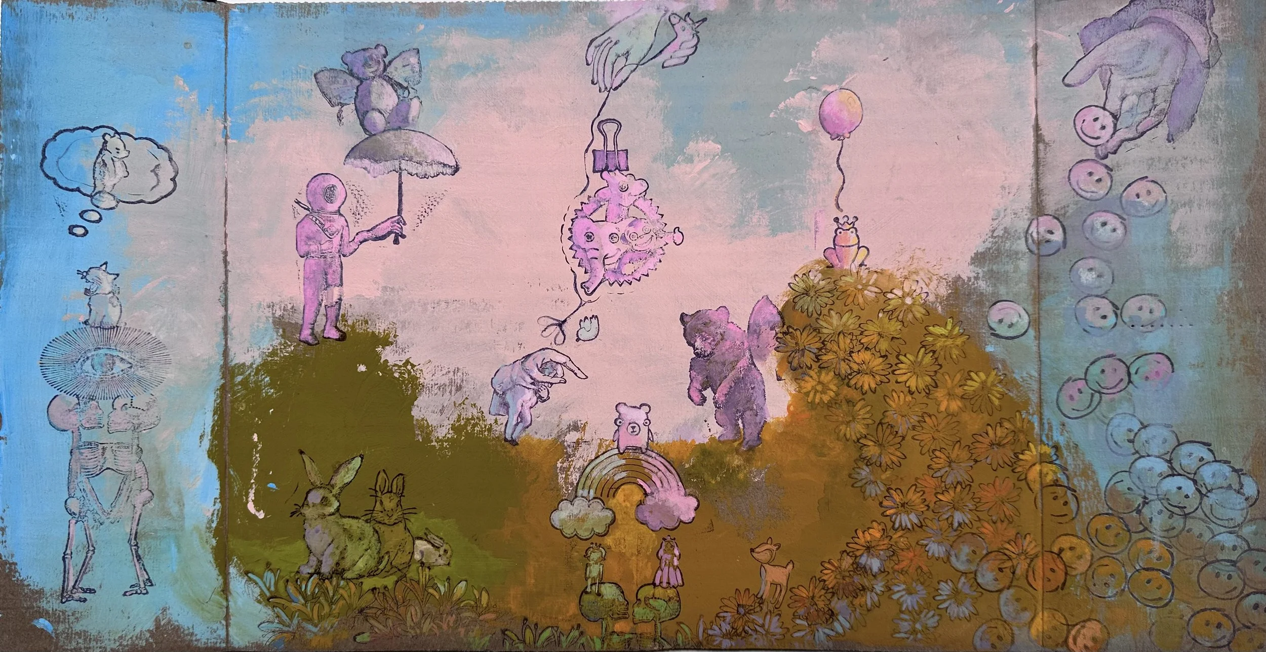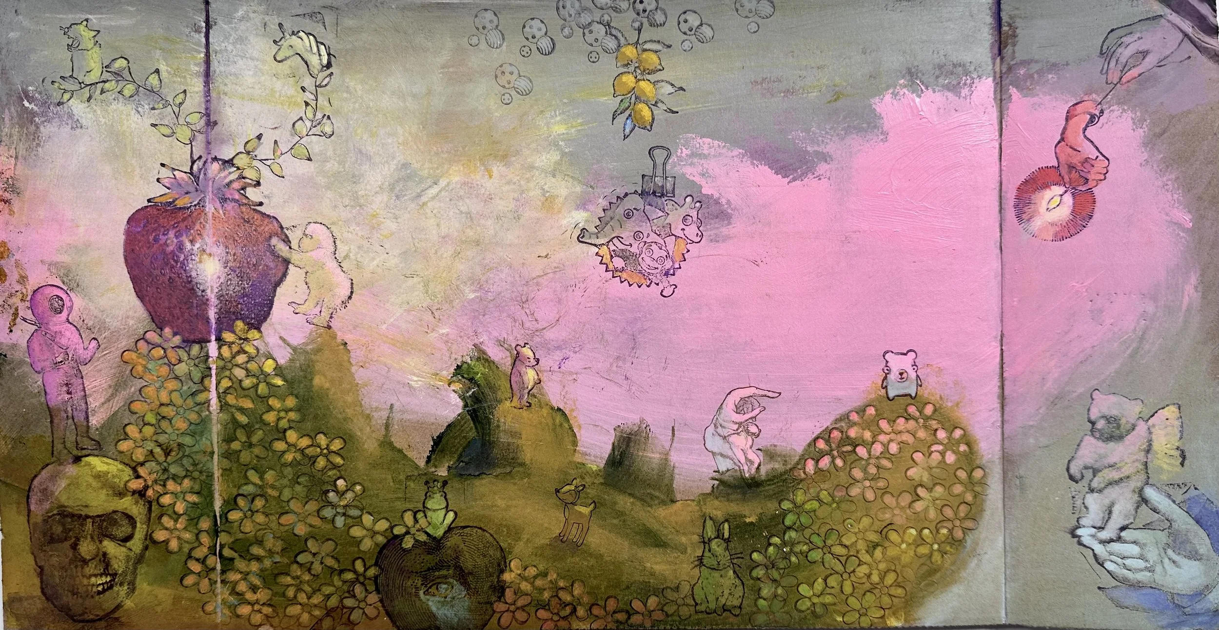 Acrylic, Gouache, Mixed Media on Cardboard, 9.5” x 17.5” 2024