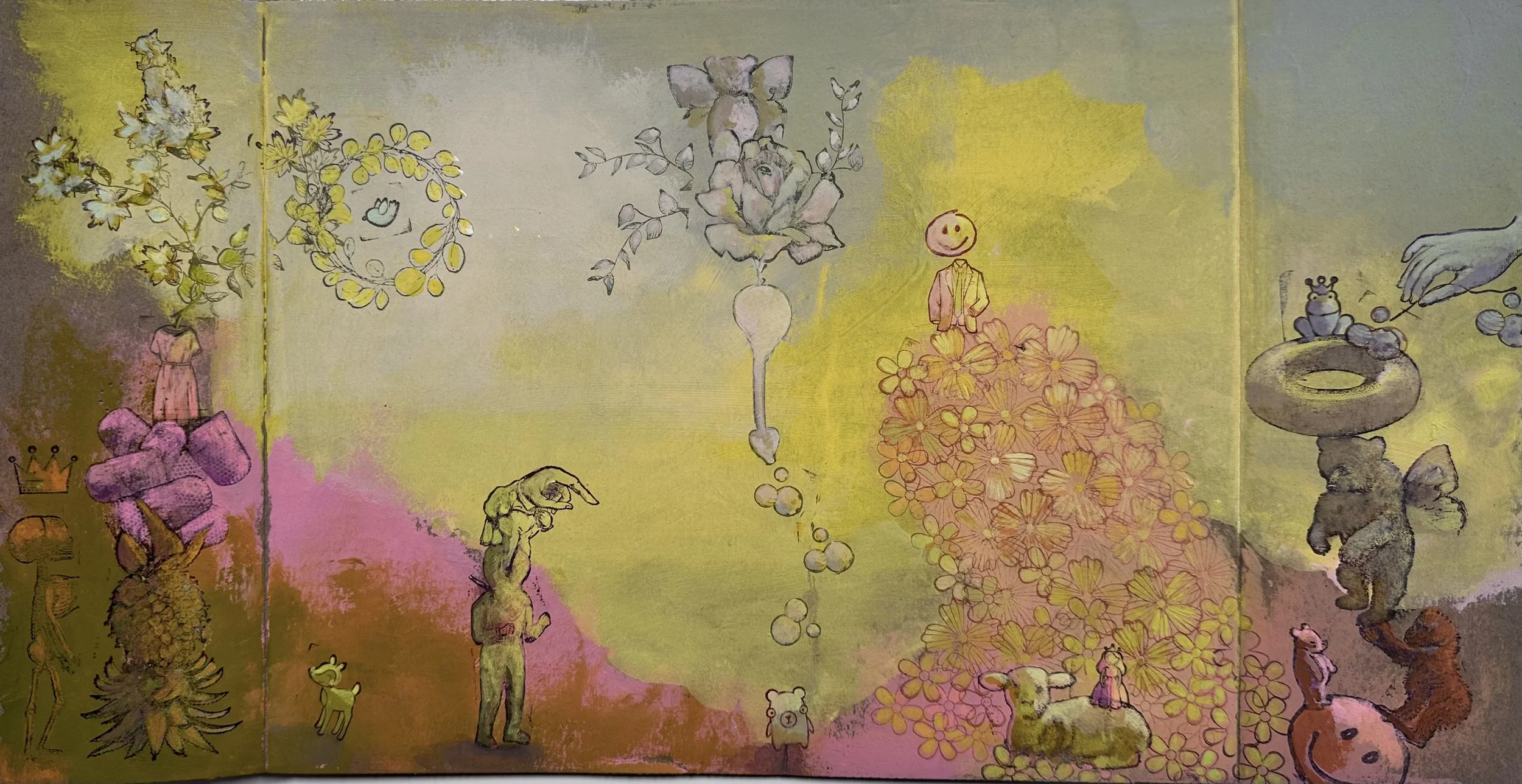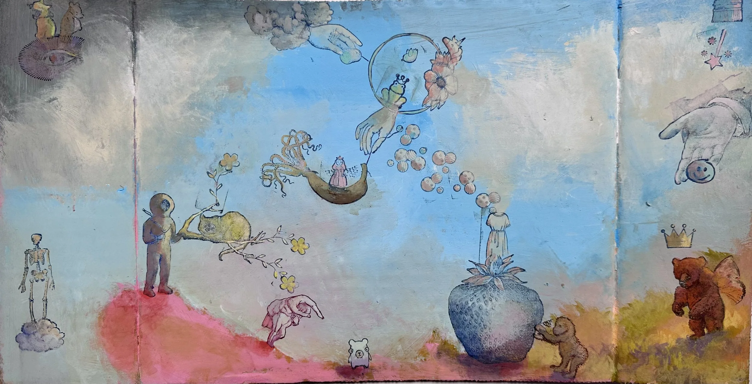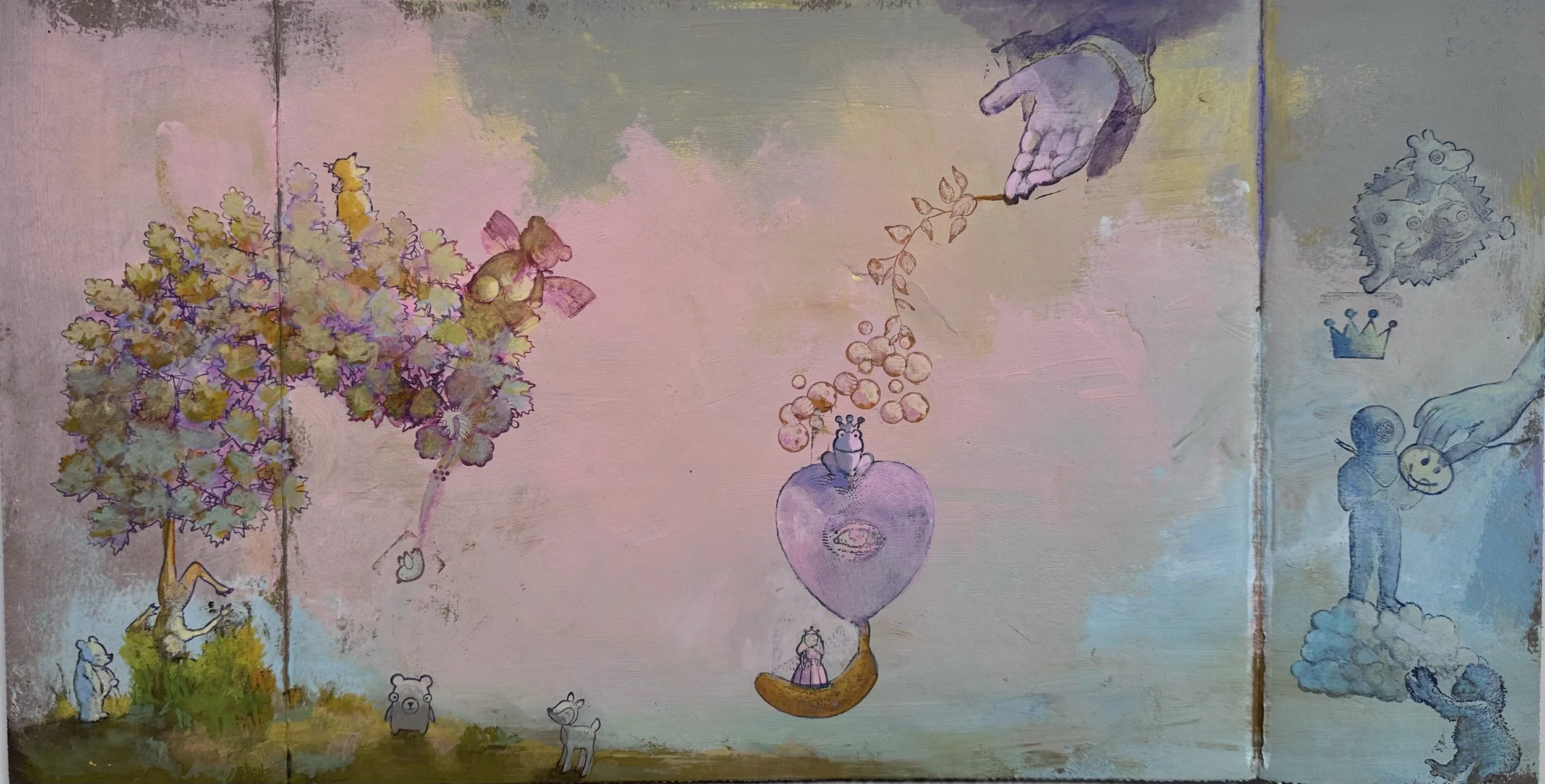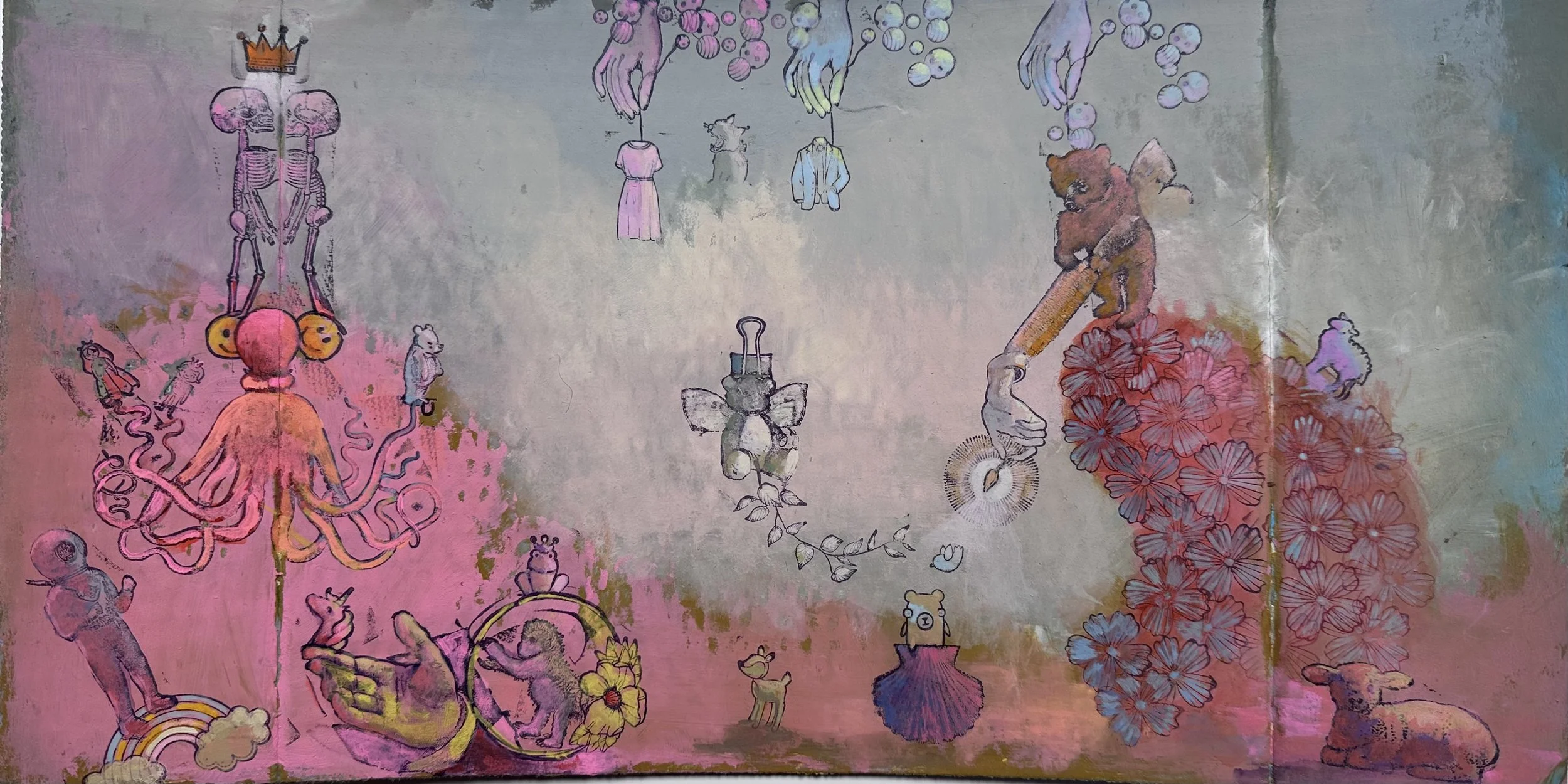 Acrylic, Gouache, Mixed Media on Cardboard, 9.5” x 17.5” 2024